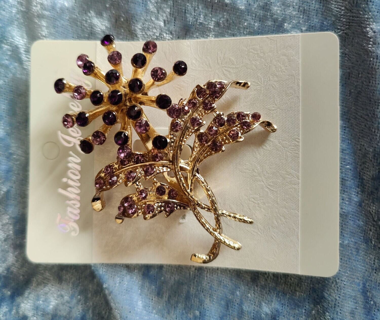 Wunderschöne Brosche - Modeschmuck mit lila Schmucksteinen auf goldfarbener Fassung. 7cm x 6 cm.